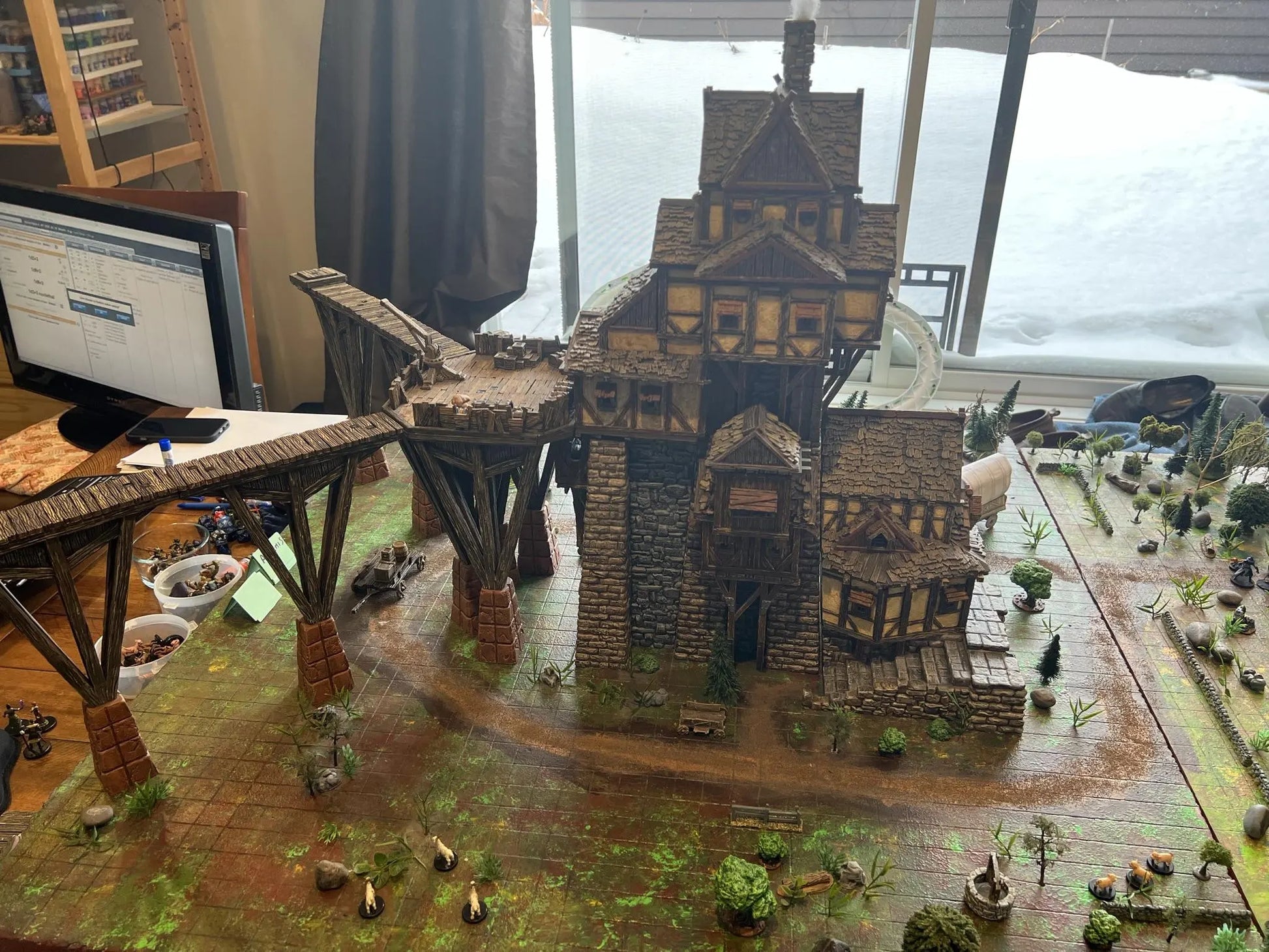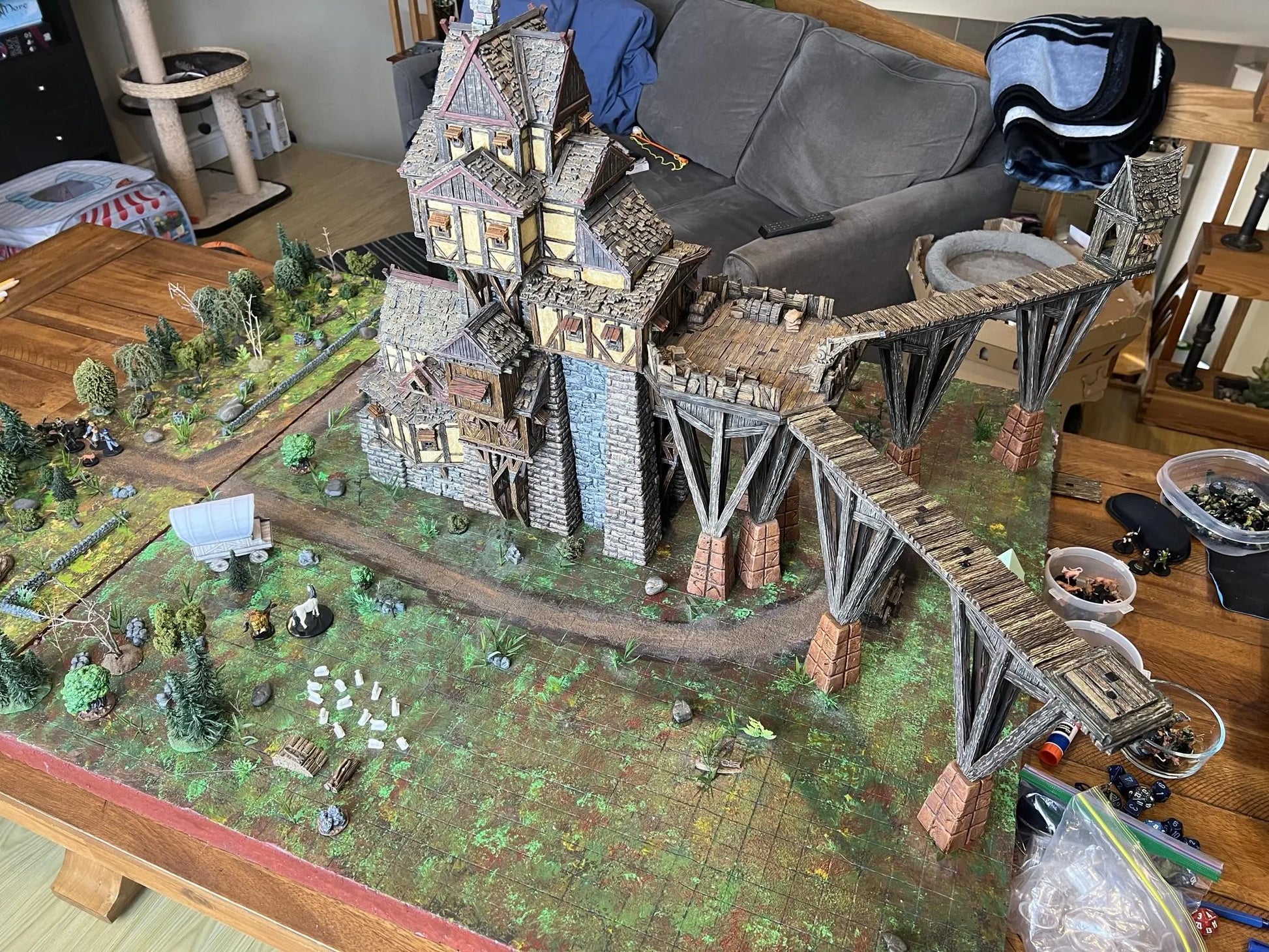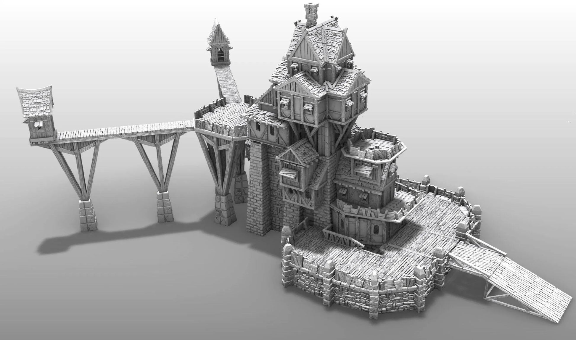 The 28-32mm Enormous Tower Manor set adds perfect detail to your tabletop historic or fantasy village or town! The full structre has a 3x2x4 foot footprint . that is 900mmx1200mmx600mm. This comes unpainted and printed in high quality PLA + in 0.1mm resolution.