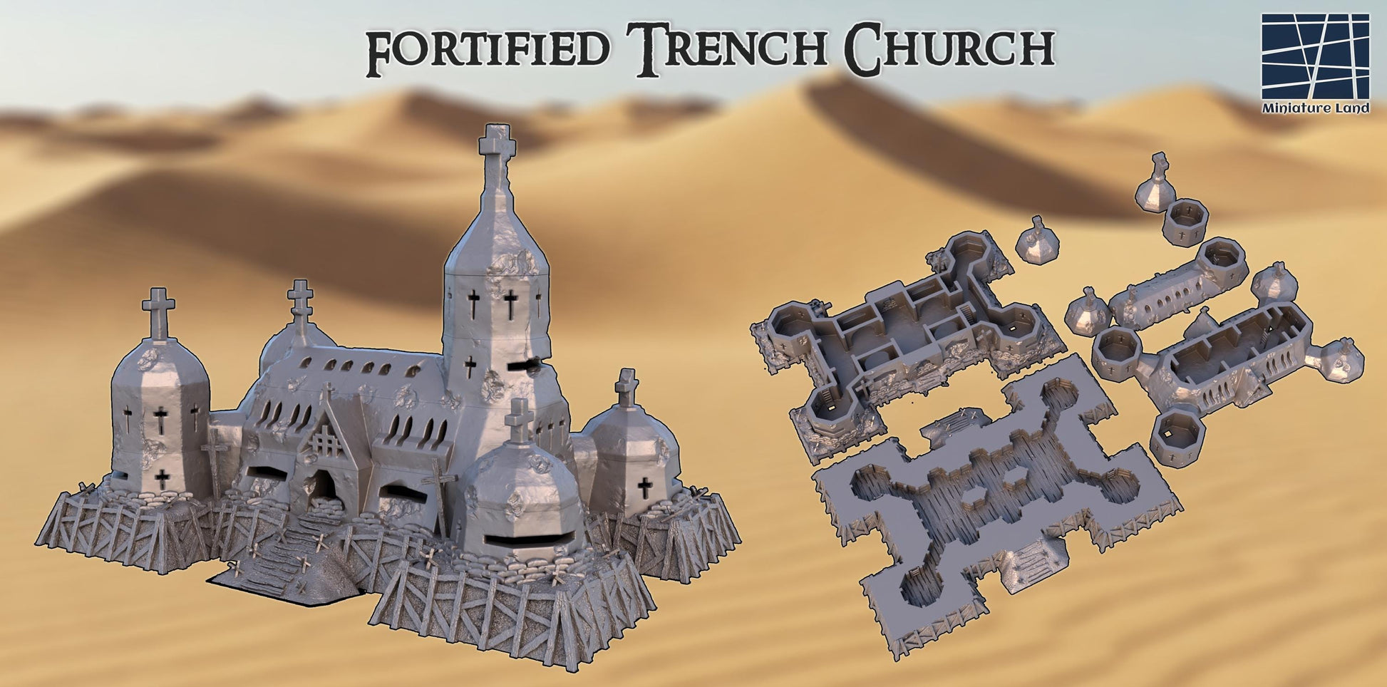 Fortified Trench Church - Tabletop Terrain - 32MM, 28 MM, Tabletop 3D Printed Terrain by MiniatureLand, Perfect for Wargaming and RPGs