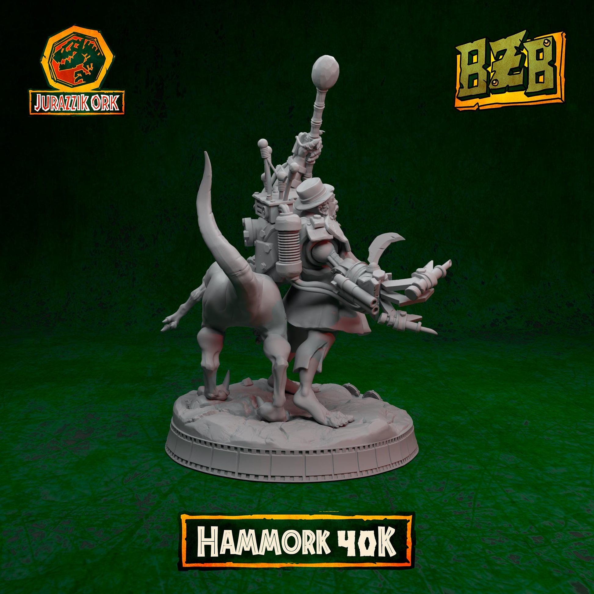 Hammork goes full 40K and even more bonkers! Strapped with extra gear, mad goggles, and that classic big boss energy, this version brings out his wilder side. Choose between the solo pose or the one where he's joined by a raptor gnawing on a bone-because even in the grimdark, there's always room for a bit of bite.