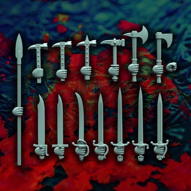 Imperial Landsknecht Handweapon and Shield Miniatures, Weapon Conversions Fantasy by Reptilian Overlords, perfect for Fantasy Wargames