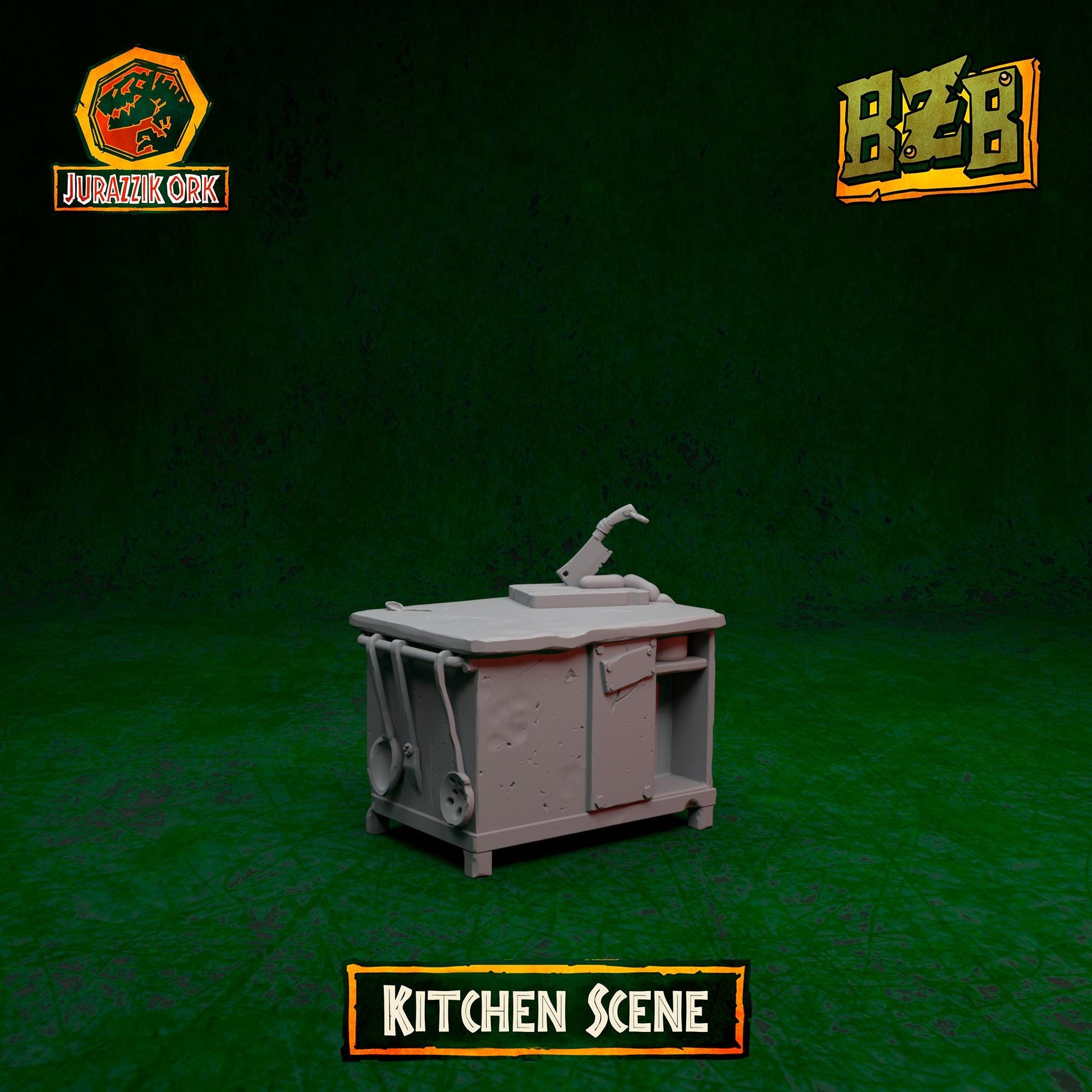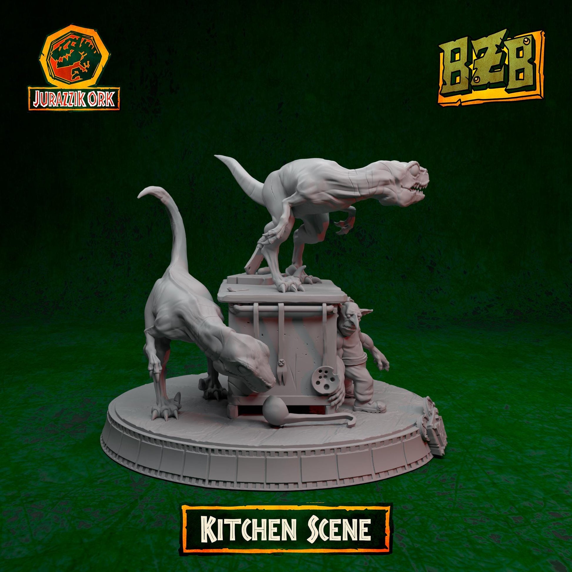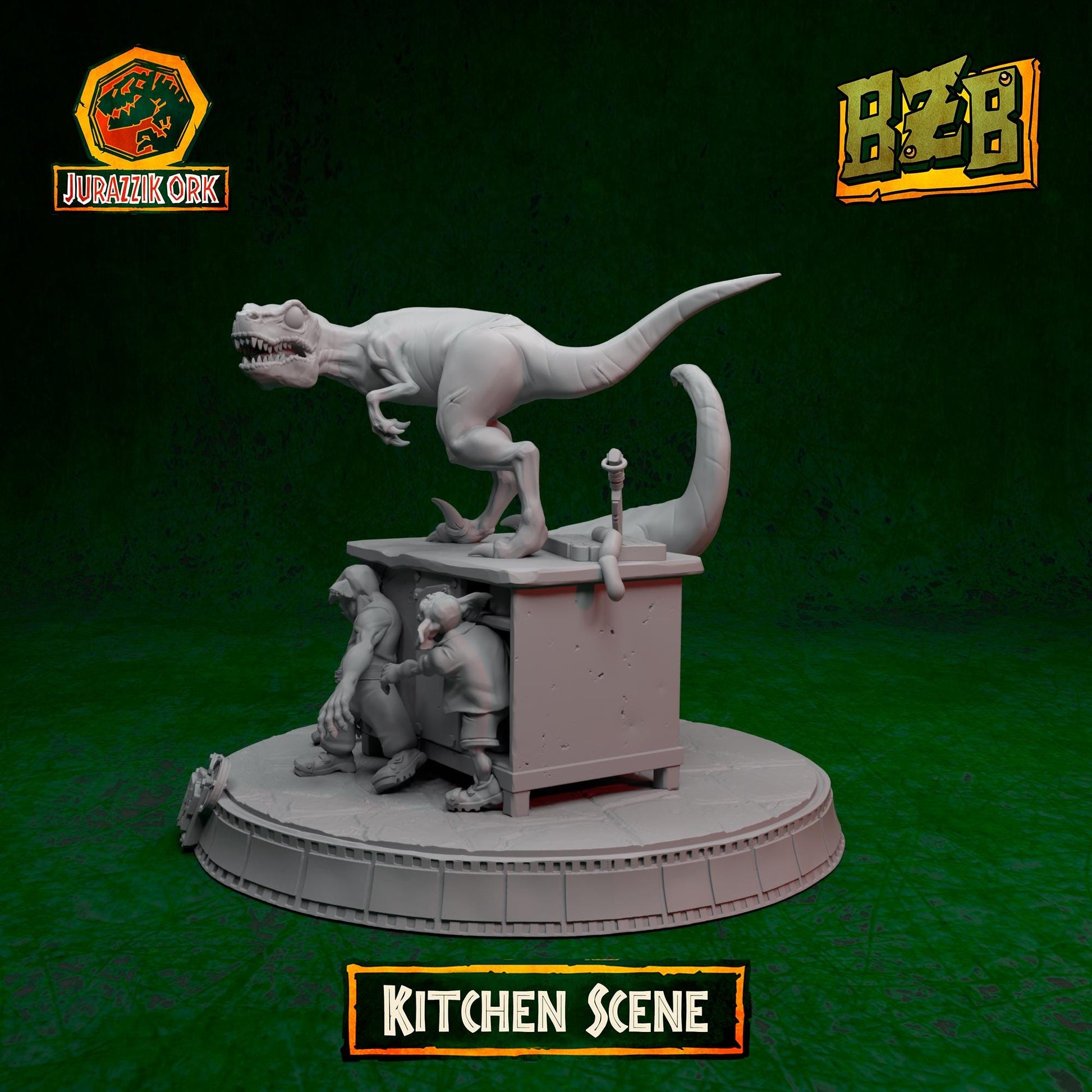 Kitchen - Scene, Jurazzik Ork, Movie-inspired Orkish Menace Sculpted by Big Zkreen Boyz, Grimdark Compatible, Scaled for Sci-Fi Wargames