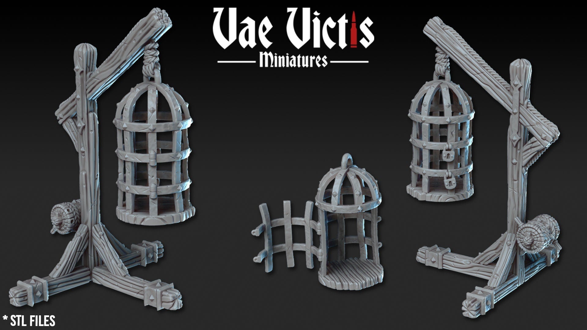 Torture Equipment - This set includes grimly detailed torture equipment, featuring a gibbet and an open cage. Ideal for adding a dark and menacing atmosphere to your tabletop scenes.