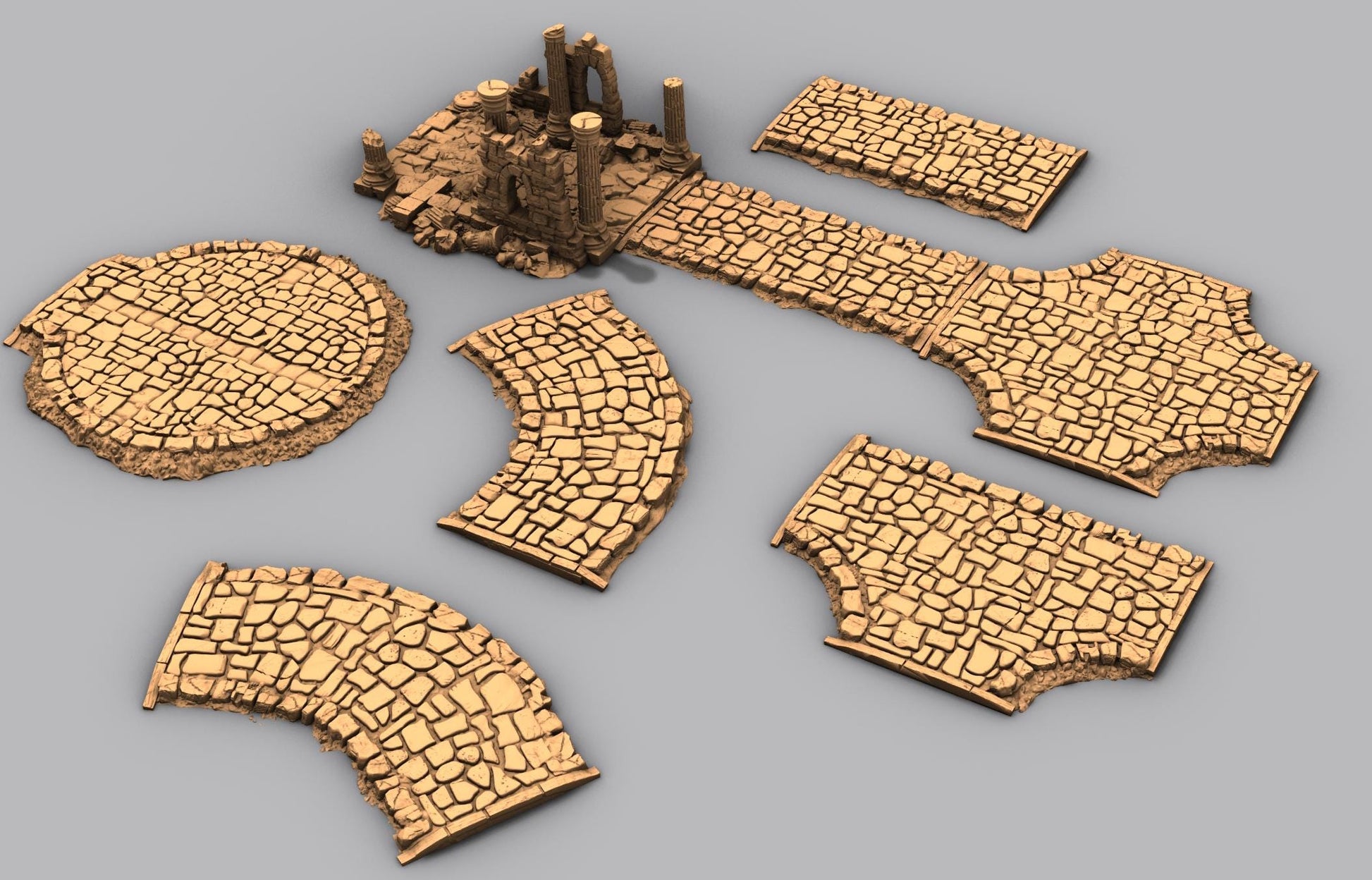 Queens Road: This is a standalone set of 13 cobblestone road tiles. They feature 100mm in width. They can optionally tie into our kings road set, any of our high profile dirt road or our Lost City road system.