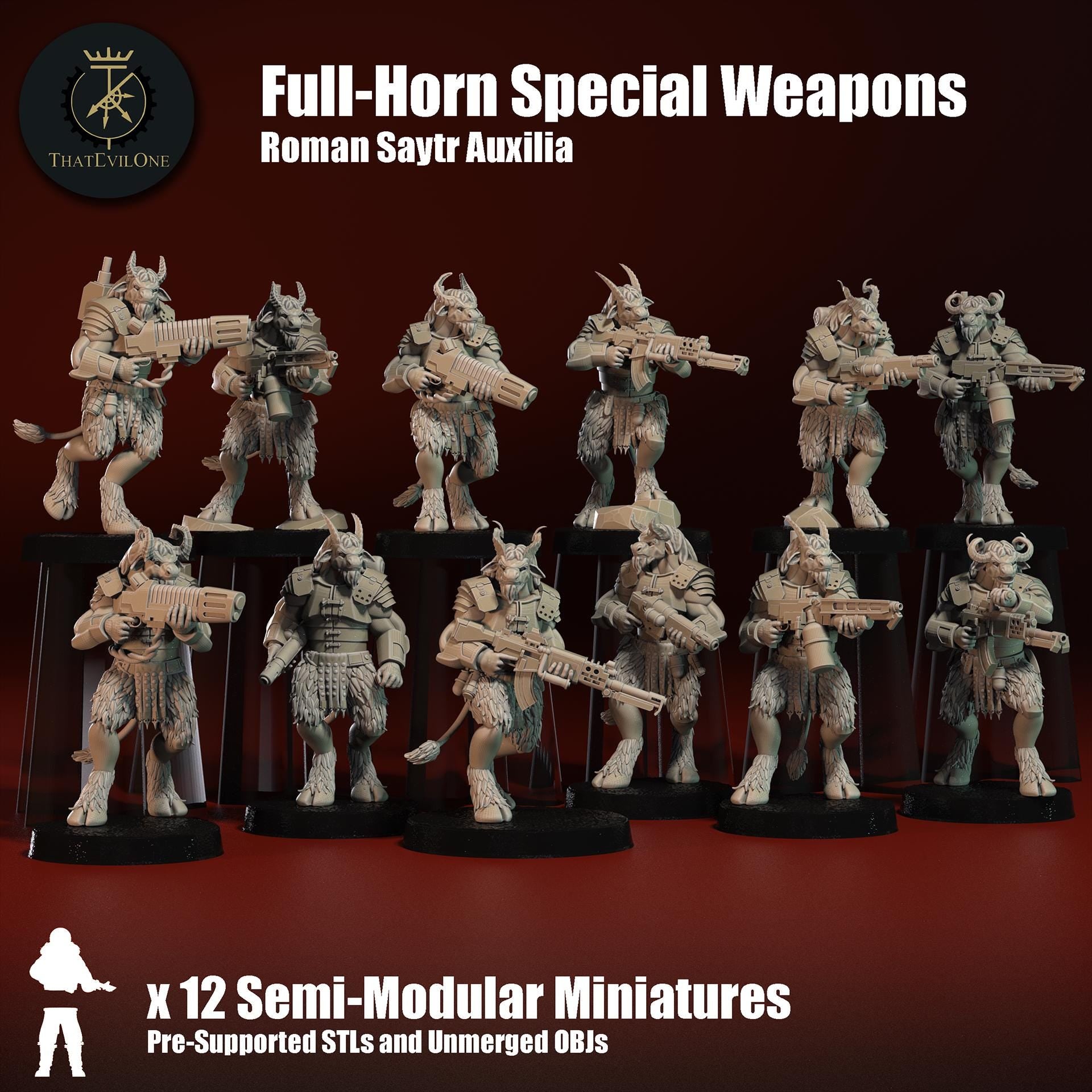 Unleash tactical mayhem with this set of 12 Roman Saytr Full-Horn Special Weapon - semi-modular miniatures designed by ThatEvilOne! TerrainForgeStudio is proud to be a licensed printer of these incredible designs. Perfect for use in Sci-fi Wargames.